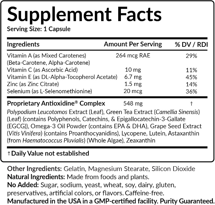Sunsafe Rx also contains a precise mixture of natural ingredients called Proprietary Antioxidine Complex, which includes Polypodium leucotomos leaf extract (PLE), green tea extract (Camellia sinensis leaf) (containing polyphenols and catechins including epigallocatechin-3-gallate (EGCG)), omega-3 fatty acids (containing eicosapentaenoic acid (EPA) and docosahexaenoic acid (DHA)), grape seed extract (Vitis vinifera) (containing proanthocyanidins), lycopene, lutein, astaxanthin (from Haematococcus pluvialis (Whole Algae)), and zeaxanthin.